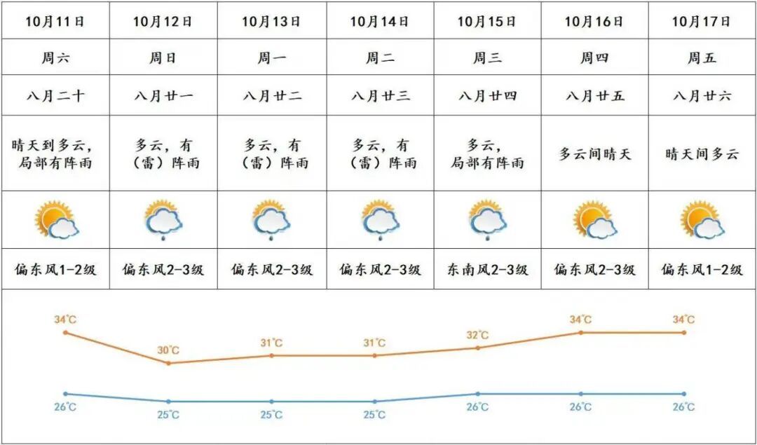 11日,南部市县多云间阴天,有分散(雷)阵雨,其余市县多云间晴天,局部有(雷)阵雨。最高气温:中北部市县33℃—36℃,其余市县31℃—33℃。