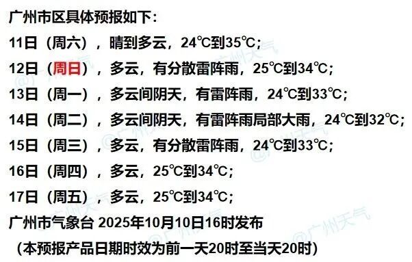 广州天气方面,今天还是晴热干燥的天气,12日起天气转向不稳定,雷雨重返,局部雨势较大,气温略降。